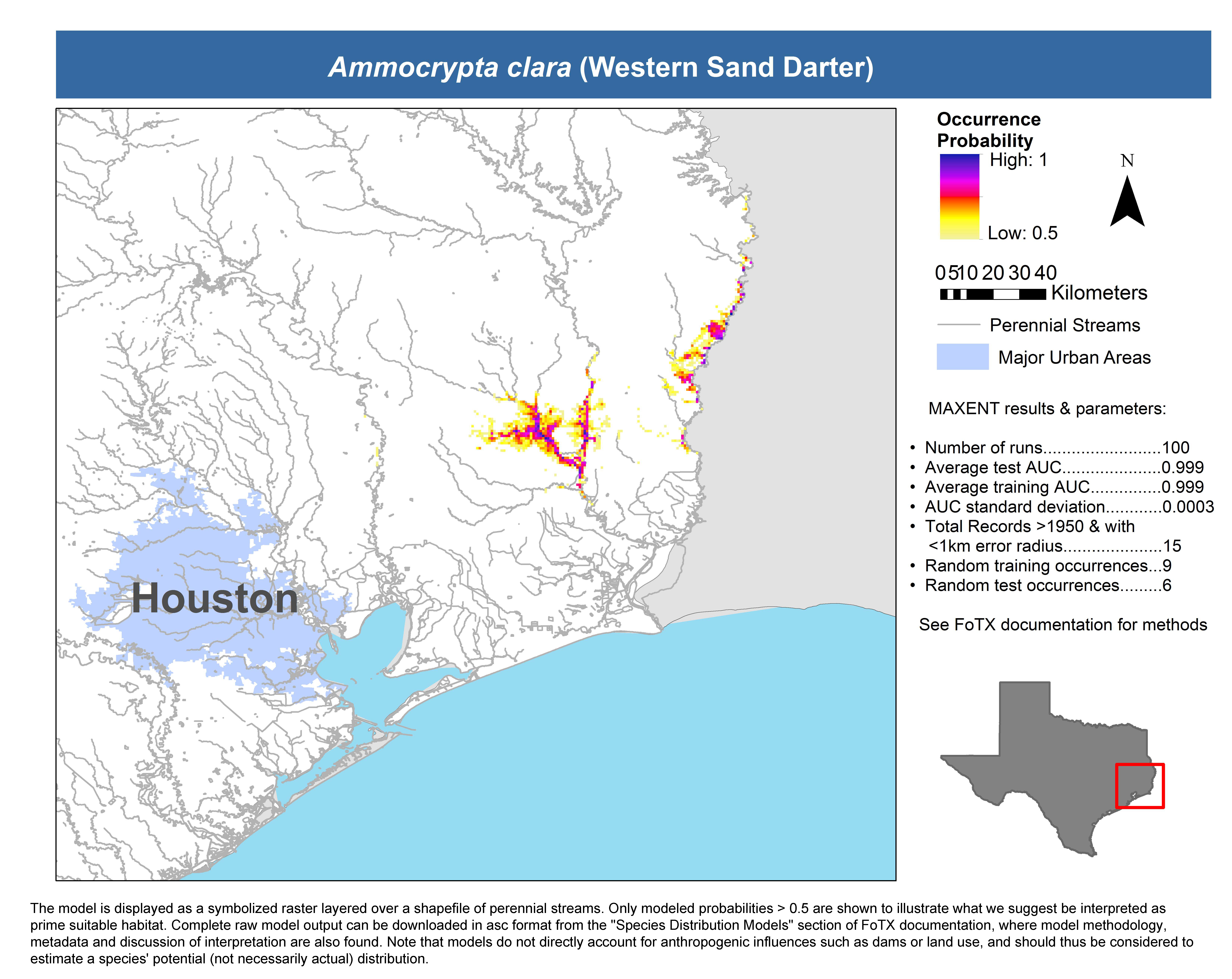 Mapped modeled probabilities of species occurrences can be viewed and model outputs formatted for analysis may be downloaded via the links below. Models available are considered the first class of models available, and as indicated by Model Class "01". Future derivations and alternate model versions will be indicated as subsequent classes. Documentation for specific methods of construction and suggested interpretation for model class 01 is found in the "FoTX SDM Documentation" section of FoTX Documentation and it is displayed below the table of links to model files.