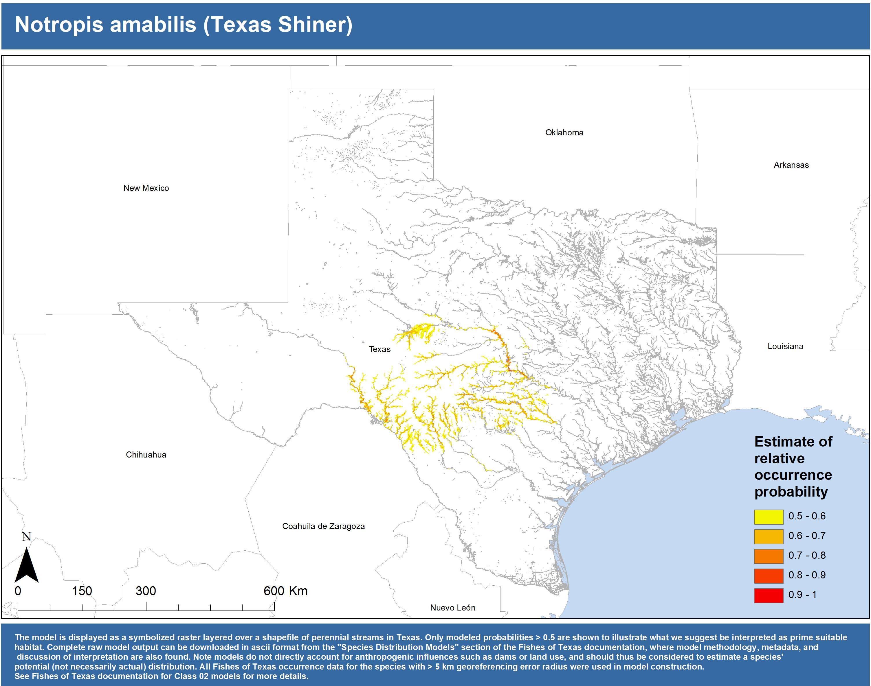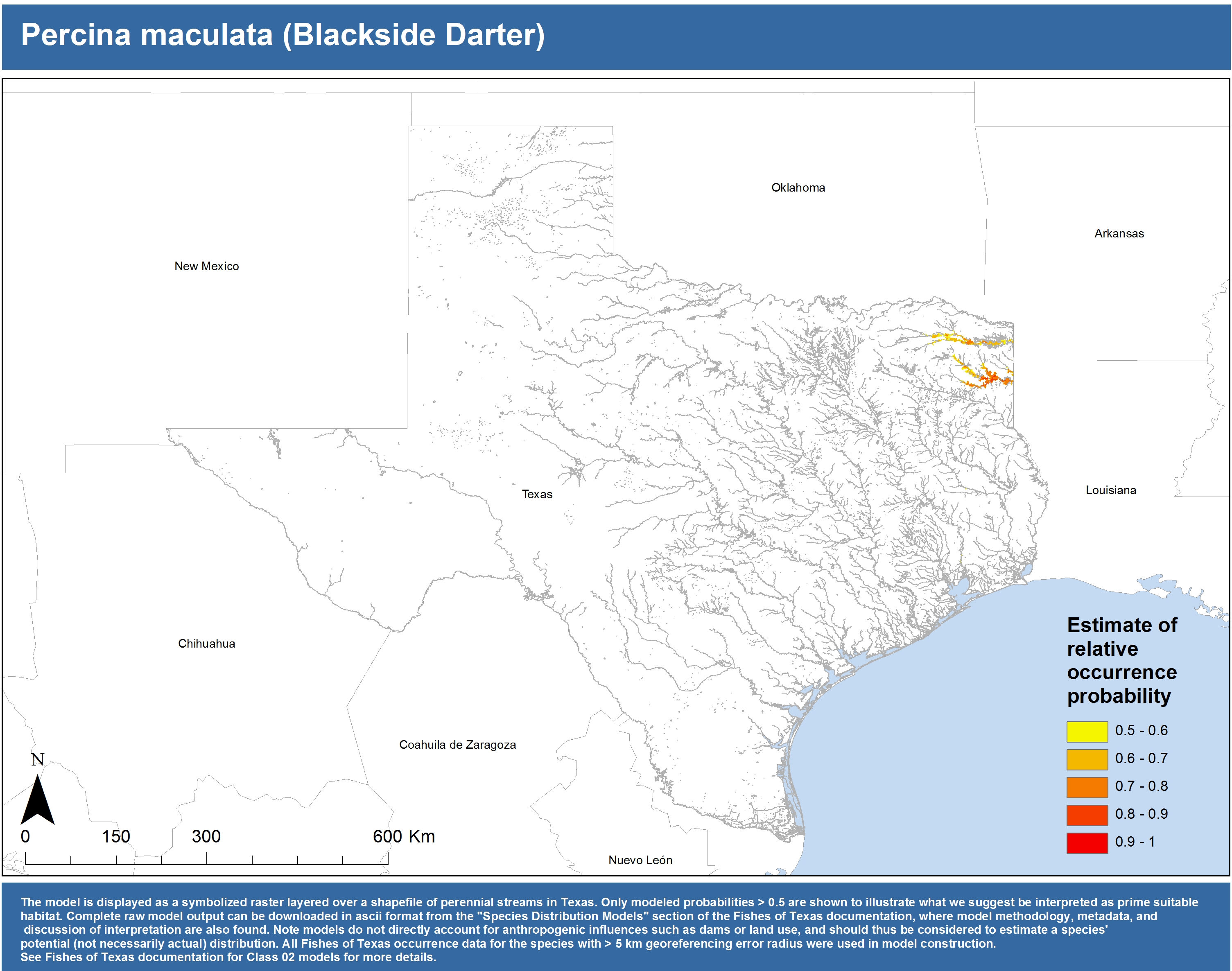 | Catostomidae | Cycleptus | elongatus | 02 | zip | jpg | This model combined records from C. elongatus with C. sp. within the Rio Grande basin. Note the lack of Colorado Records within the FoTX database cause low probabilities within that basin. | Blue Sucker |